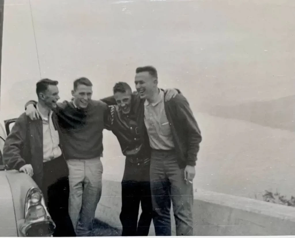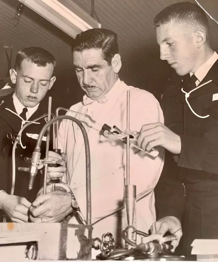 Once exams were over, the focus shifted to the Christmas Ball, scheduled for December 20th, and to our departure for two weeks of Christmas leave the following day. We all managed to find a date for the Ball and also managed to each acquire a bottle of liquor, which we squirreled away to help properly celebrate the event. The night of the Ball arrived, and every one of us managed to have a great time, letting loose after a turbulent first term. After our dates had been escorted home and leave had expired, we gathered together to finish off the celebration and the remaining booze. The noise level increased coincident with the number of wild or glassy-eyed cadets. Suddenly, someone rushed in with the news that the Duty Officer – the dreaded “Gunner” Anderson – was making rounds and would in short order be inspecting all cadets in the foyer. There was a flurry of activity as various means were utilized to sober up the more inebriated cadets, with special teams dragging those who had already passed out into cold showers in hopes of at least rendering them capable of standing upright. All too soon, we were ordered to “fall in” and we made our way to the foyer where we managed to assume the proper formation, with several of our virtuously unconscious members wedged between two or three classmates. Gunner Anderson arrived and with a knowing smirk pretended to inspect us. Once he was convinced that nobody was missing and that we were probably capable of getting on an airplane in a few hours, much to our surprise and relief, he dismissed us, and we headed for our cabins to get ready to depart for home and the comfort of family and friends.
